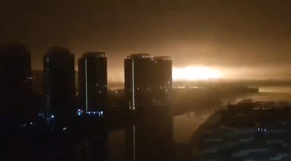 Pictured: Footage from Kiyv overnight showed a huge explosion light up the night sky. Reports said at least two huge blasts were heard in the city air raid sirens warned residents to urgently seek shelter