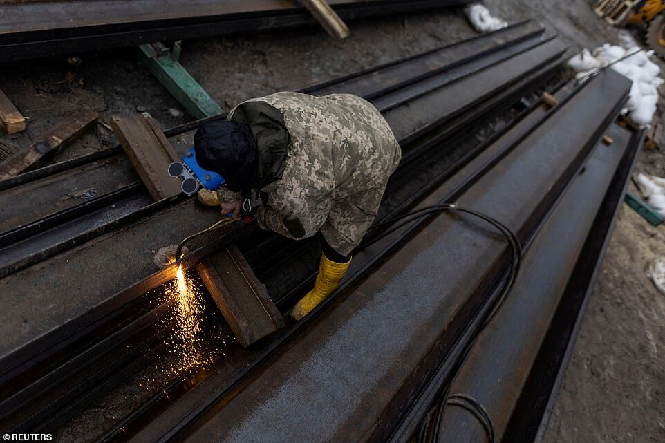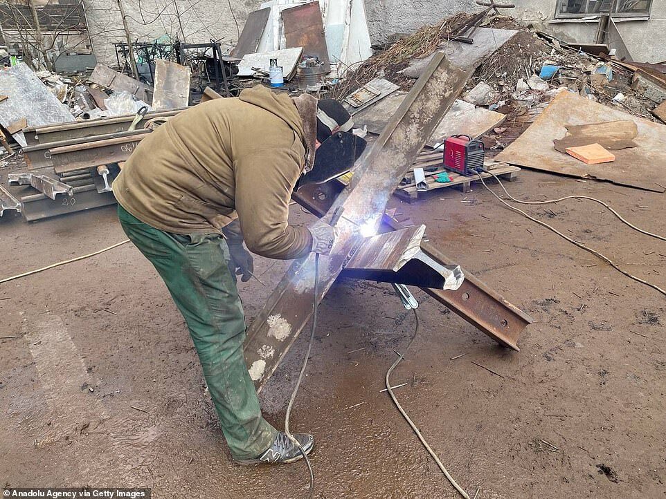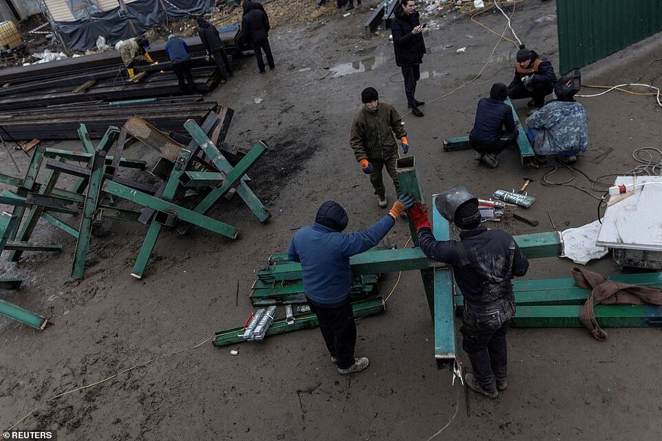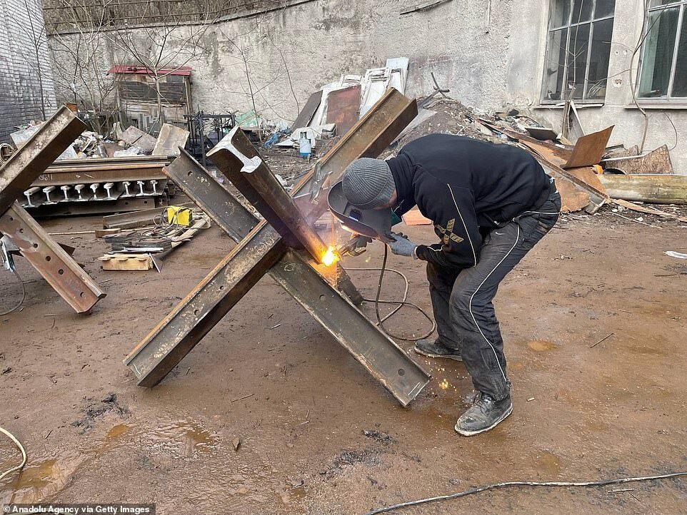 Workers from a local construction company weld anti-tanks obstacles to be place on road around Kyiv