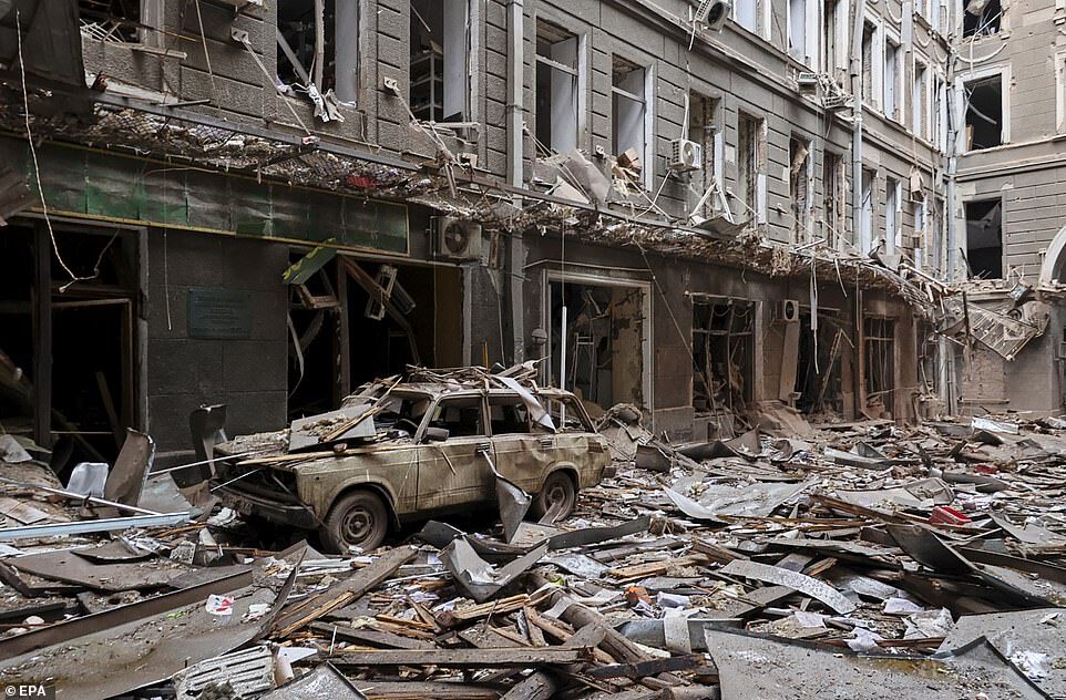 Heavily damaged buildings in downtown Kharkiv are pictured after a strike by Russian rockets on Thursday