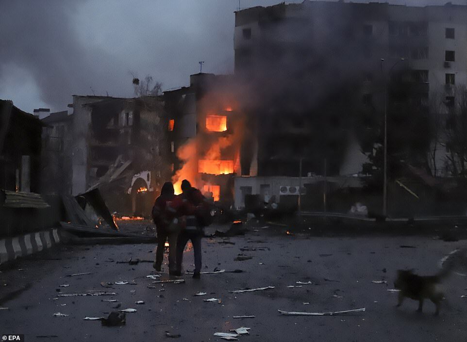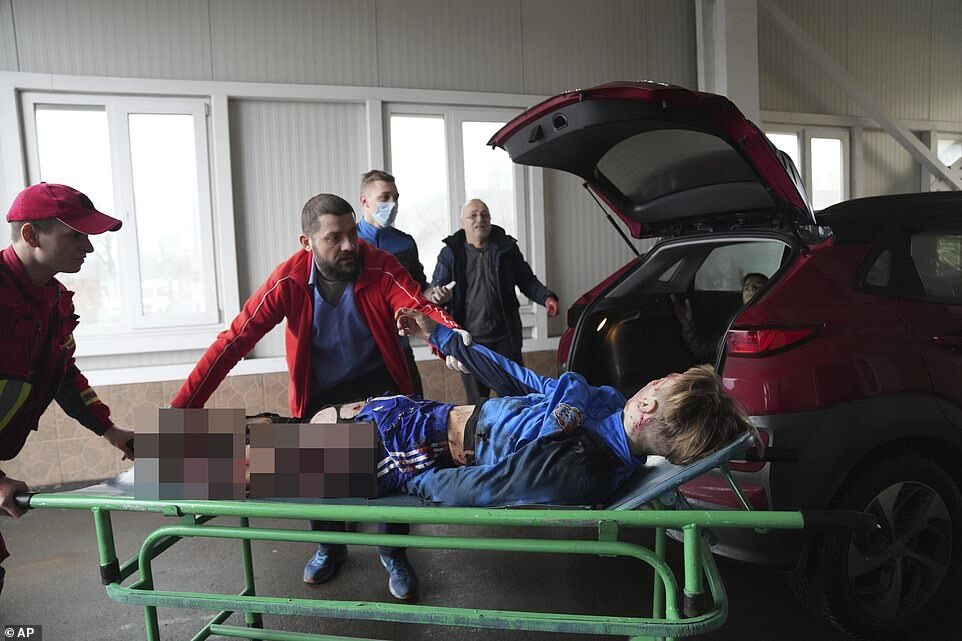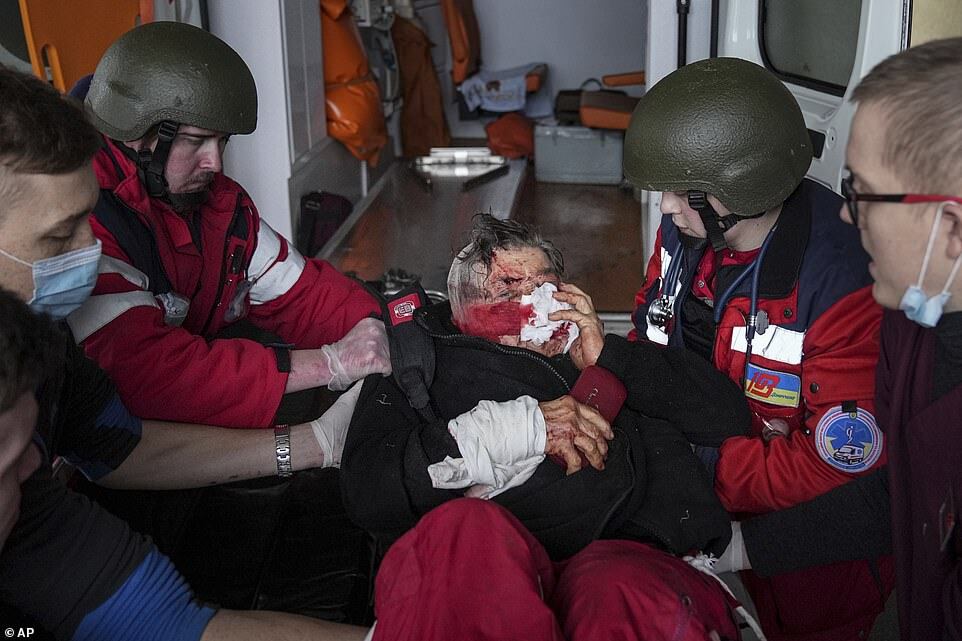 Harrowing pictures revealed at least part of the civilian death toll, with a father seen weeping over the body of his son who was killed when a Russian shell destroyed his legs. Two elderly women were also pictured being evacuated from their homes and covered in blood after Russian attacks.