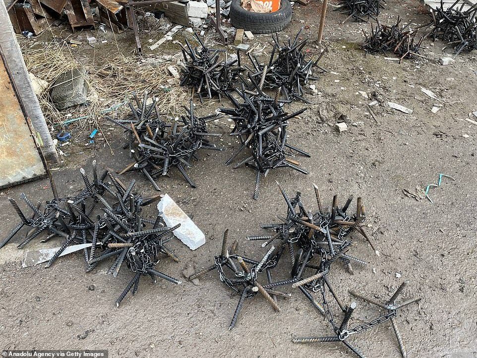 Clusters of metal spike traps designed to puncture the wheels of Russian armoured vehicles are manufactured by metal workers in Lviv, western Ukraine