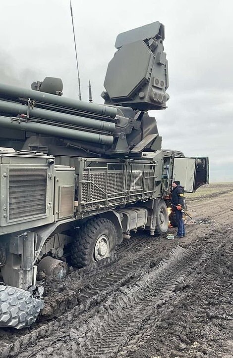 A Pantsir missile system bogged down and abandoned in a muddy field lost several of its tyres when Ukrainian forces tried to tow it away, with Trent Teletenko - a former Department of Defence civil servant - wrote on Twitter that it appears Russia has failed to maintain the tyres on its vehicles properly, leaving them brittle.