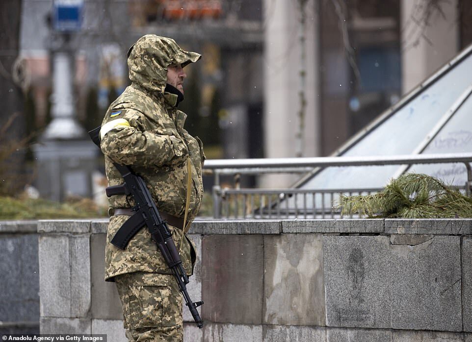A Ukrainian soldier tasked with defending Kyiv is pictured patrolling the streets shortly after airstrikes on the city