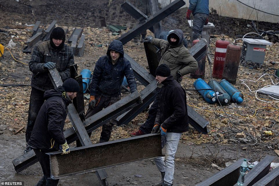 Civilians build iron barricades and traps to block armored vehicles in the city of Lviv, western Ukraine