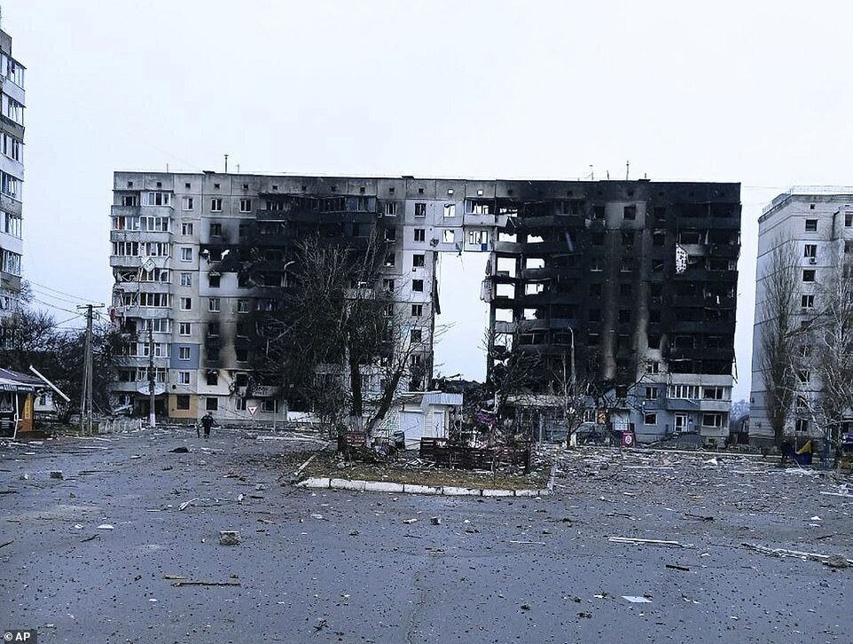 Burned buildings which were hit by shelling is seen in small city of Borodyanka near Kyiv