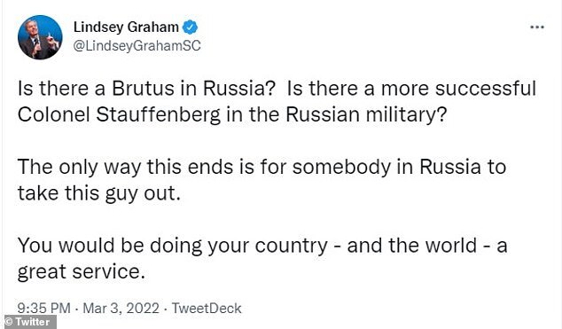 Senator Lindsey Graham (pictured) called on Russians to carry out the assassination of President Putin in his latest series of tweets