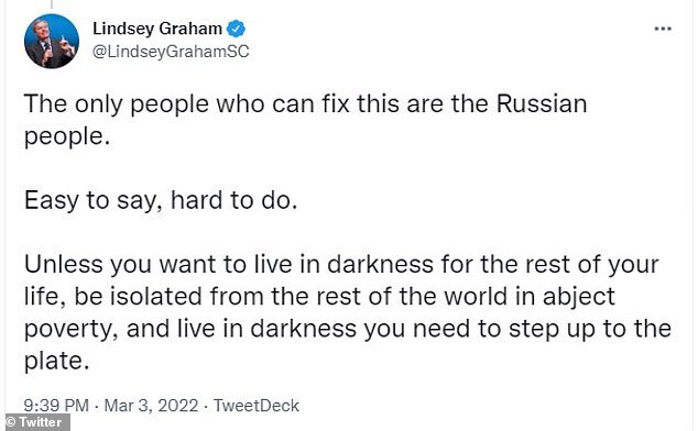 - In a separate tweet Graham added that the responsibility of eliminating Putin laid solely in the hands of Russian citizens