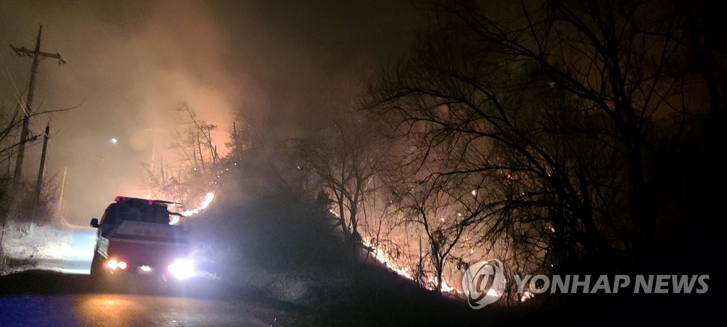 하지만 야간인데다 수일째 이어진 건조한 날씨에 순간 풍속이 초속 7m 안팎의 바람까지 불어 진화에 어려움을 겪고 있다.
