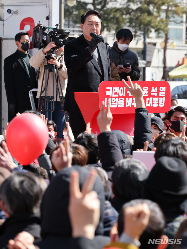 [서울=뉴시스] 국회사진기자단 = 윤석열 국민의힘 대선 후보가 6일 오전 서울 중구 동대문디자인플라자(DDP) 앞에서 유세를 하며 지지를 호소하고 있다. 2022.03.06. photo@newsis.com