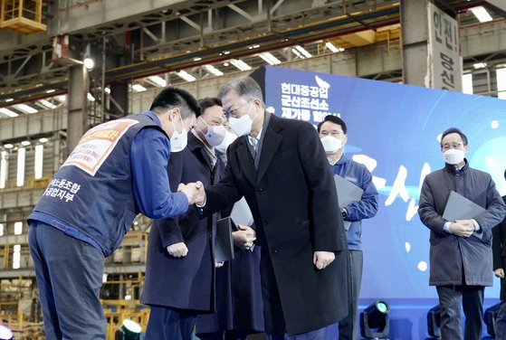 문재인 대통령이 공식선거운동 기간이던 지난달 24일 전북 군산시 현대중공업 군산조선소에서 열린 군산조선소 재가동 협약식에 참석해 협약식을 마친뒤 정병천 현대중공업 노조지부장과 주먹인사를 하고 있다. 뉴스1