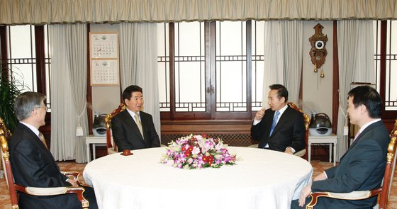 노무현 전 대통령과 당선인 시절이던 이명박 전 대통령과 대통령 관저에서 만나 인사를 나누고 있다. 당시 만남에는 비서실장이던 문재인 대통령이 배석했다. 중앙포토