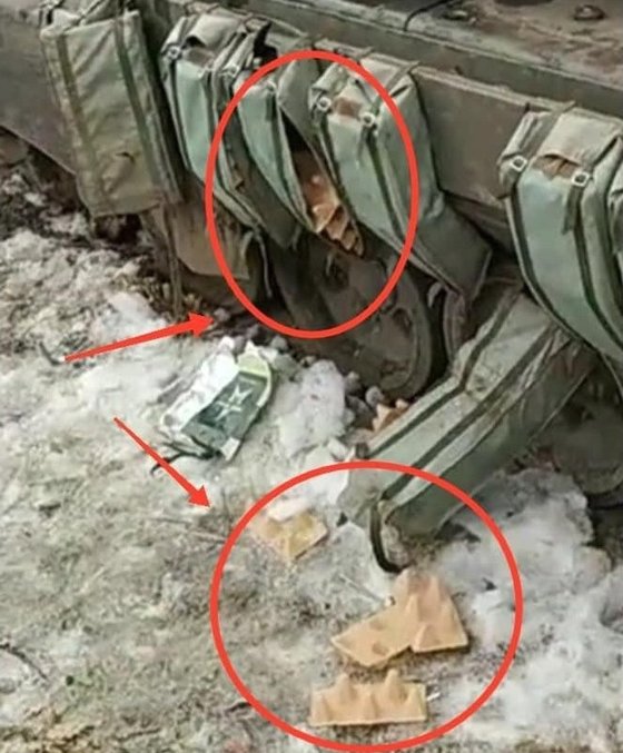 우크라이나가 파괴한 러시아 전차의 외부 주머니에서 발견 된 물체(빨간 원). 계란판으로 보인다. 이 주머니는 전차의 방어력을 높이기 위해 비금속 장갑 충전재가 들어가는 곳이다. Ory 트위터 계정