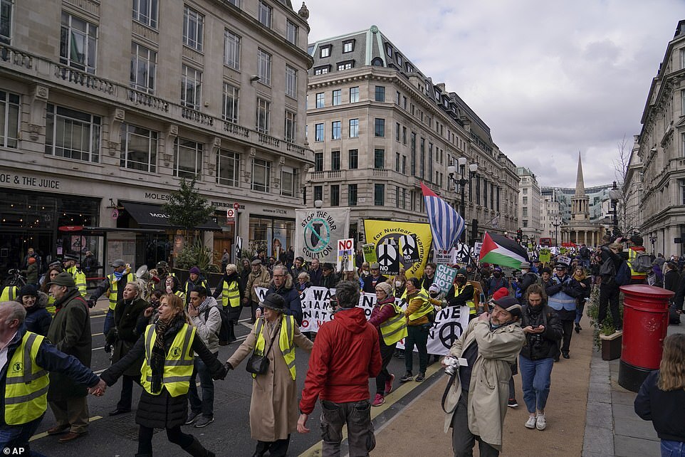 Protesters march on Trafalgar Square during a demonstration organised by the Stop the War Coalition against NATO and Russia's military operation Ukraine