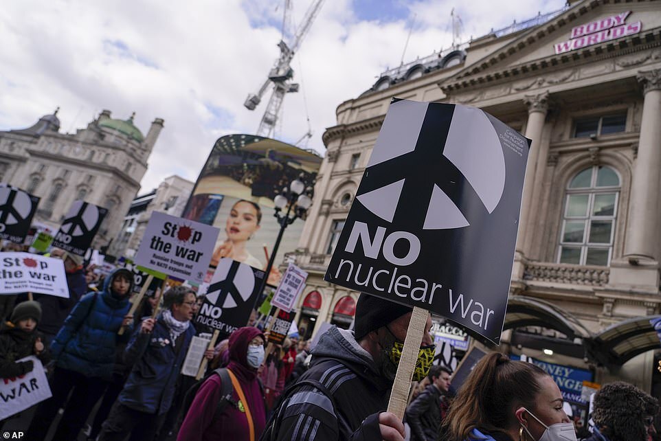 People hold banners, flags and placards during the anti-war march in London, many of them imploring western leaders to prevent a nuclear war