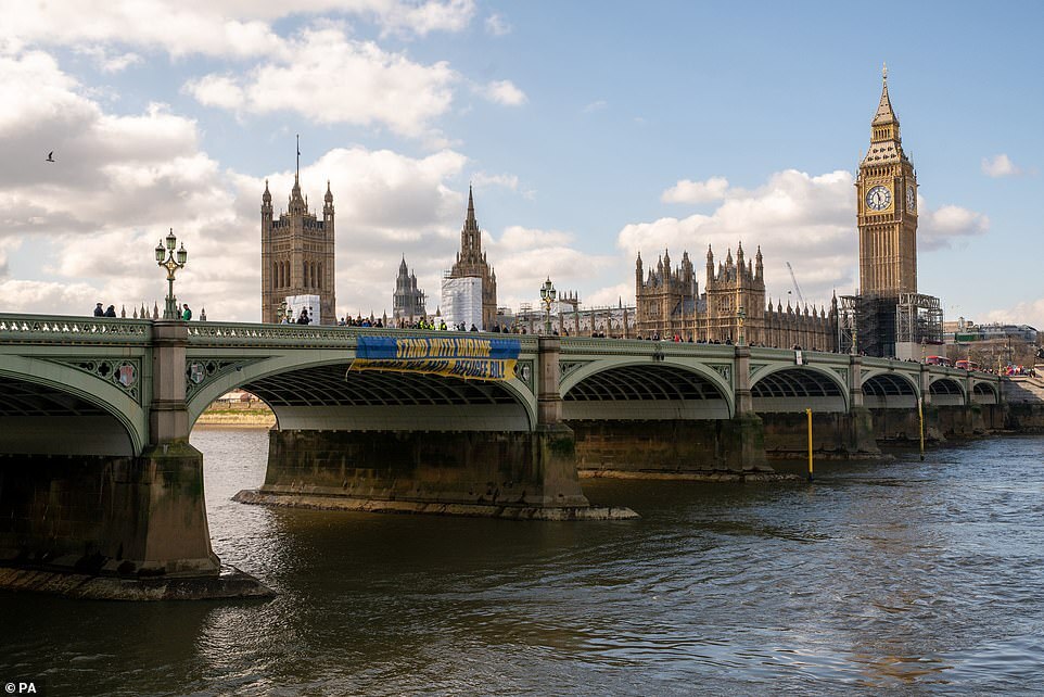Protesters from a group named 'Freedom from Torture' dropped a banner onto Westminster Bridge in central London, calling on the Government to scrap its Nationality and Borders Bill which could criminalise asylum seekers, including those who might come from Ukraine, without a visa