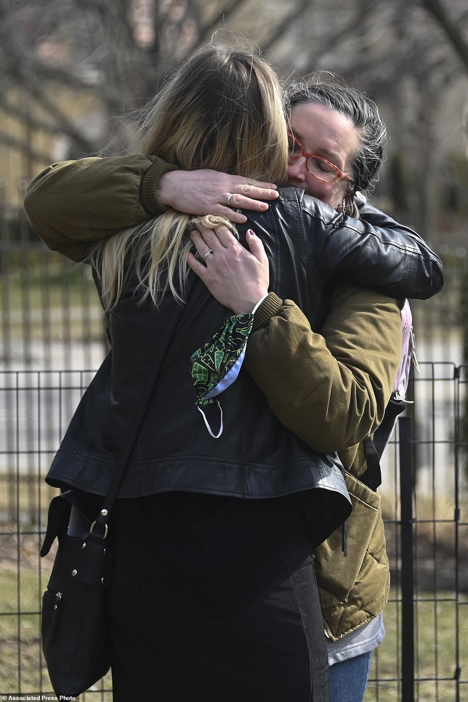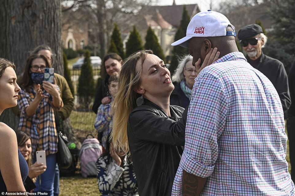 Newlywed Maria, back to camera, hugs a friend before she married her husband David during their ceremony at a home, Saturday, March 5, 2022, in Oak Park, Ill. Maria, who is from Ukraine, is headed back there to volunteer, a few days after she was married
