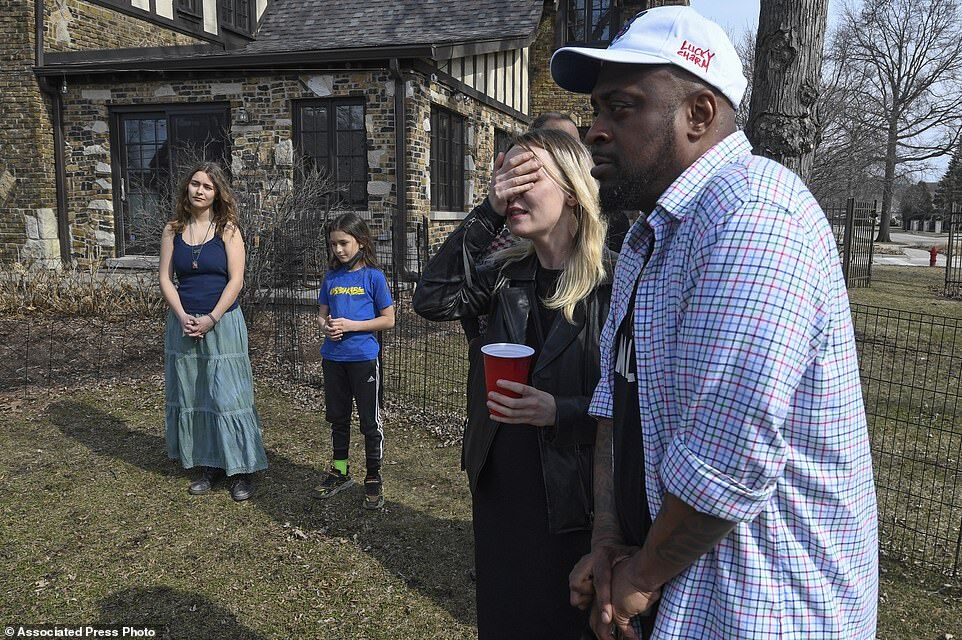 Newlyweds Maria and David, with her children Sasha, and Kira, during their ceremony at a home, Saturday, March 5, 2022, in Oak Park, Ill. On Monday, she plans to fly to Poland, then make her way to the Ukrainian border, ultimately aiming to volunteer to fight for her home country
