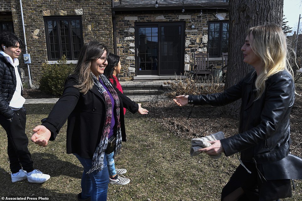 Newlywed Maria, right, greets a friend before she married her husband David during their ceremony at a home, Saturday, March 5, 2022, in Oak Park, Ill. Maria, who is from Ukraine, is headed back there to volunteer, a few days after she was married