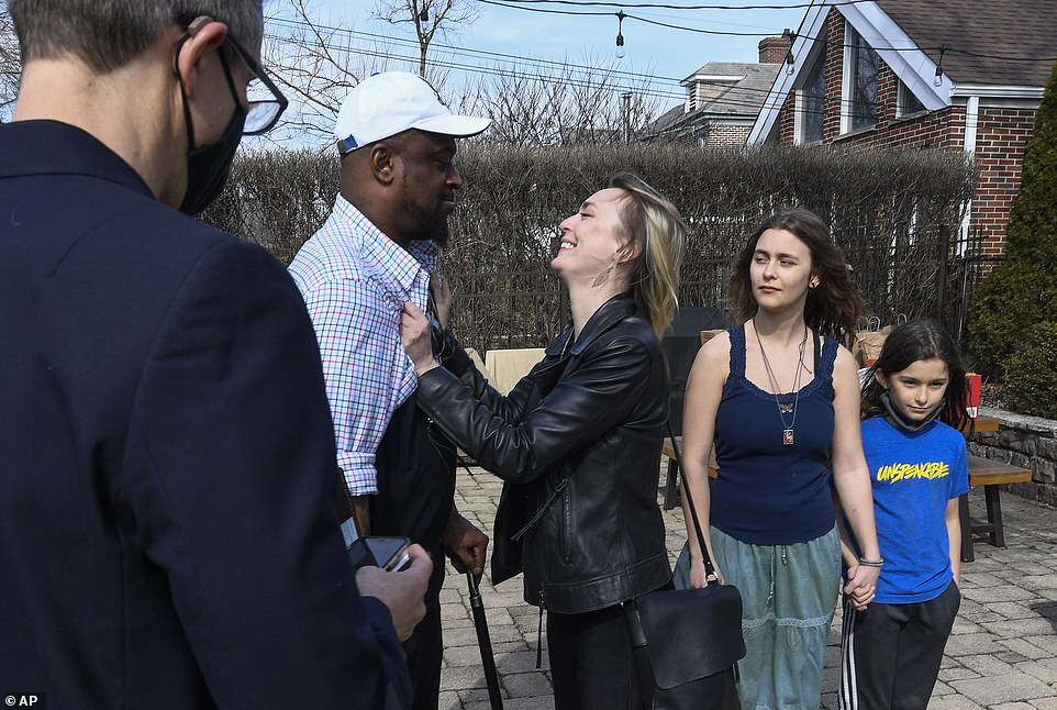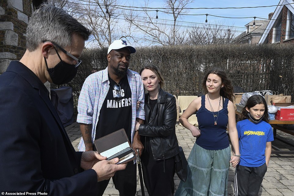 Newlyweds Maria and David, with her children Sasha and Kira, during their ceremony at a home, Saturday, March 5, 2022, in Oak Park, Ill. Maria, who is from Ukraine, is headed back there to volunteer, a few days after she was married