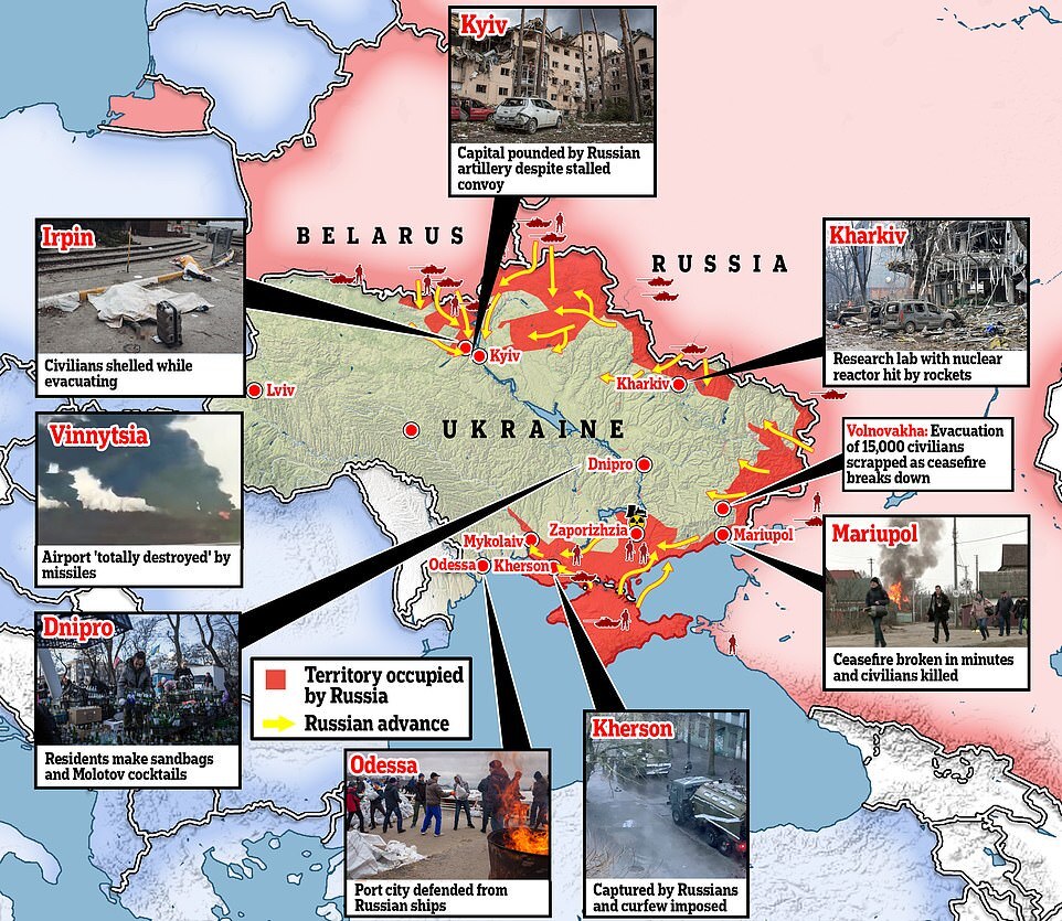Ukrainian forces were defending Odesa, Ukraine's biggest port city, from repeated attempts by Russian ships, Ukrainian presidential adviser Oleksiy Arestovich said. Pictured: Volunteers filling sandbags to build barricades in Odesa, Ukraine, on Saturday March 5, 2022