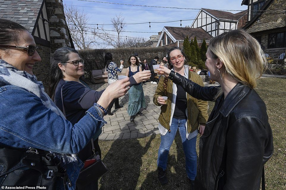 Newlywed Maria toast with friends during her wedding ceremony at a home, Saturday, March 5, 2022, in Oak Park, Ill. On Monday, Maria plans to fly to Poland, then make her way to the Ukrainian border, ultimately aiming to volunteer to fight for her home country