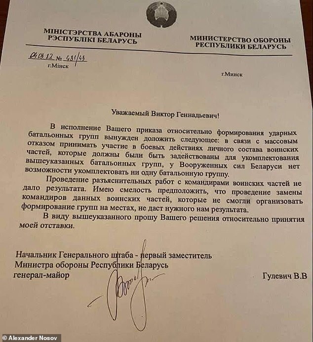 Gulevich’s resignation came after the head of Belarus’ President's Office, Arestovych, adviser to Belarusian leader Alexander Lukashenko, warned Ukraine that the bombing and shelling of the cities will intensify. He advised the Ukrainians to prepare for an "attrition war”. Belarus’ Chief of the General Staff of Armed Forces, in his letter, said: "Conducting explanatory work with the commanders of military units did not produce results,” referring to his troop's reluctance to join the missions against Ukraine. “I have the courage to assume that replacing the commanders of these military units, who could not organize the formation of groups on the ground, will not give us the desired result," his letter read.