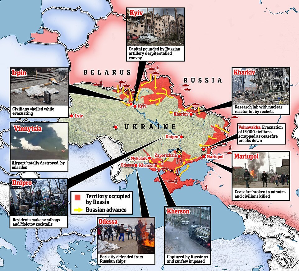 Across Ukraine, ceasefires brokered by the Red Cross were breached and humanitarian corridors were closed. The UK Government said Russia was targeting 'populated areas' to break the resistance of the Ukrainian people.