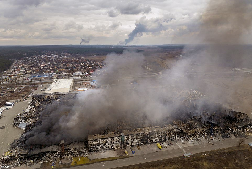 Plumes of smoke rise into the air after a factory and a store are left burning after being bombarded in Irpin