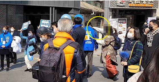 송영길 더불어민주당 대표가 7일 오후 서울 신촌에서 선거운동을 하던 중 유튜버 A(70)씨가 휘두른 망치(노란원)에 머리를 맞는 사고를 당했다. 유튜브 '동작사람 박찬호' 캡처