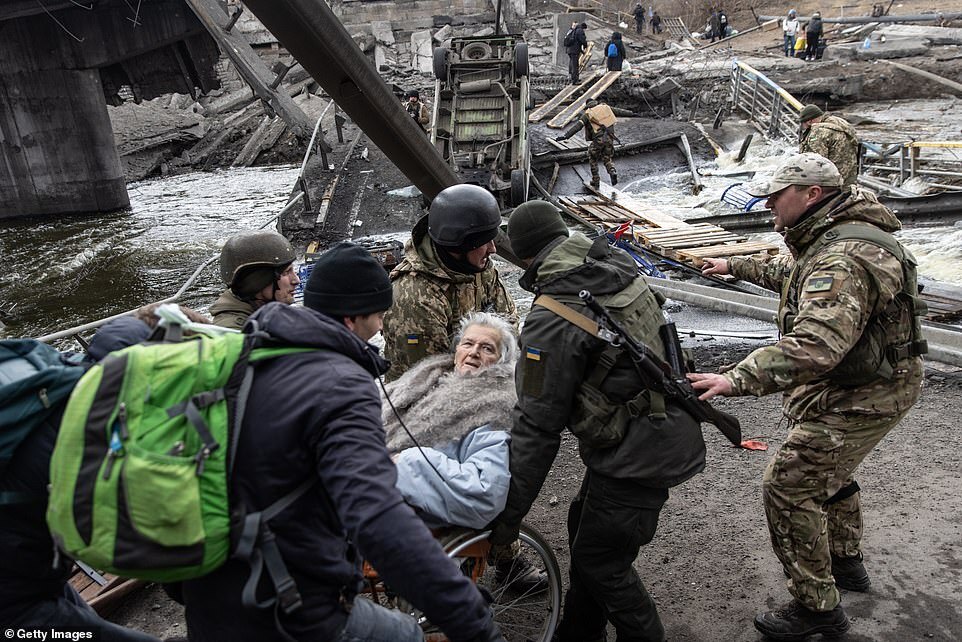 Elderly people and families with children are helped across a fast-flowing river underneath a destroyed road bridge outside Irpin, a city to the west of Kyiv, which Russian forces have been attacking