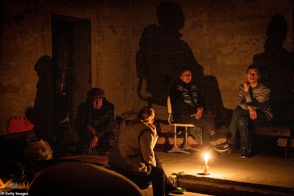 Residents shelter by candle light in the basement of a building in Irpin as Russian forces moved through the city today, on day 12 of the invasion