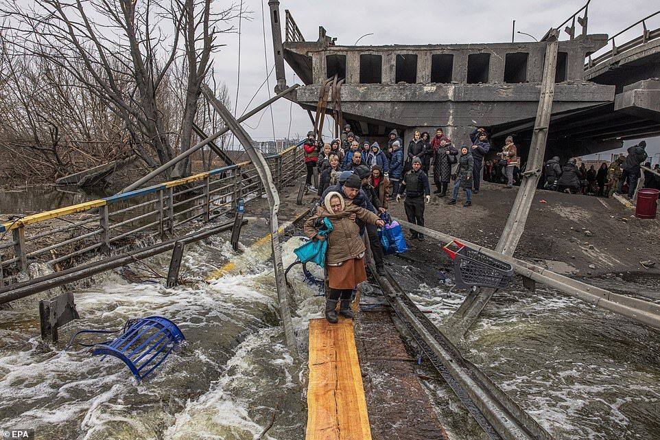 Hundreds of civilians were pictured trying to flee the city of Irpin, to the west of Kyiv, which has been the scene of heavy Russian bombardment in recent days - helped across a partially-destroyed bridge by members of the Ukrainian military who had blow it up days earlier to slow the Russian advance