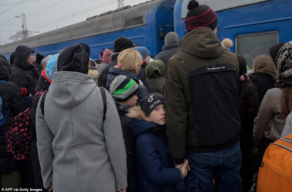 Hundreds of people queue for trains to Poland following the Russian invasion of Ukraine, in Lviv, Ukraine