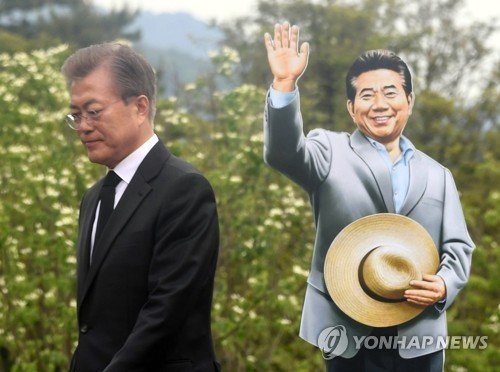 문재인 대통령이 2017년 5월 23일 오후 경남 김해시 진영읍 봉하마을에서 열린 노무현 전 대통령 서거 8주기 추도식에서 인사말을 한 후 단상에서 내려오고 있다. 연합뉴스
