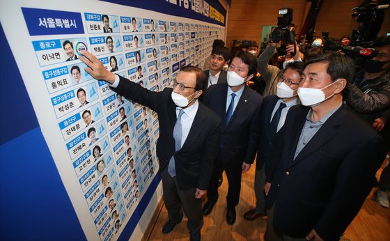 2020년 4월 총선에서 이해찬 당시 더불어민주당 상임공동선대위원장이 제21대 국회의원 선거 종합상황판에 당선 스티커를 붙이고 있다. 왼쪽부터 더불어민주당 이해찬 공동상임선대위원장, 이인영 원내대표, 더불어시민당 우희종, 이종걸 공동상임선대위원장. 중앙포토