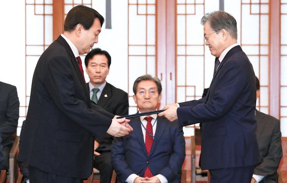문재인 대통령(오른쪽)이 청와대 본관 충무실에서 신임 검찰총장에게 임명장을 수여하고 있다. 문 대통령은 당시 윤석열 당선인에게 검찰개혁을 요청했지만, 그는 야당 대선 후보로 출마해 당선됐다. 청와대사진기자단