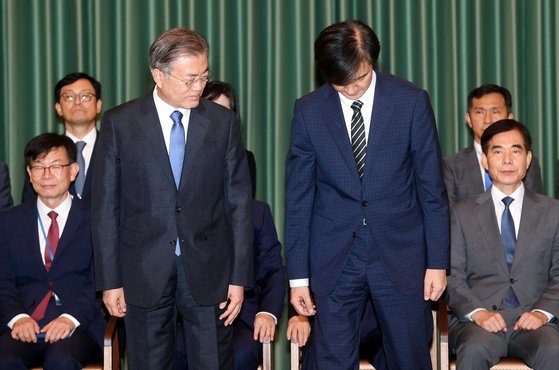 문재인 대통령이 2019년 9월 9일 오후 청와대에서 조국 신임 법무부 장관 등에게 임명장을 수여했다. 조국 전 장관이 문 대통령과 기념사진을 찍고 있다. 청와대사진기자단
