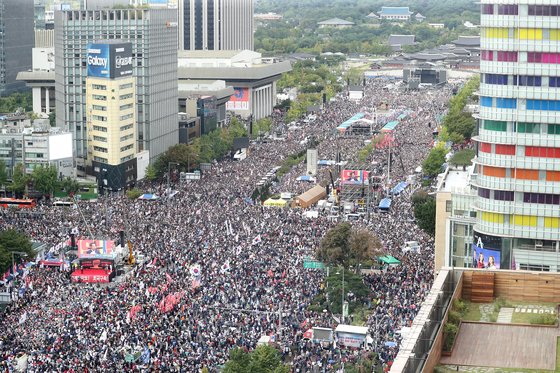 2019년 보수단체들이 서울 광화문 일대에서 문재인 정부를 비판하고 조국 당시 장관의 사퇴를 촉구하는 집회를 갖고 있다. 뉴스1