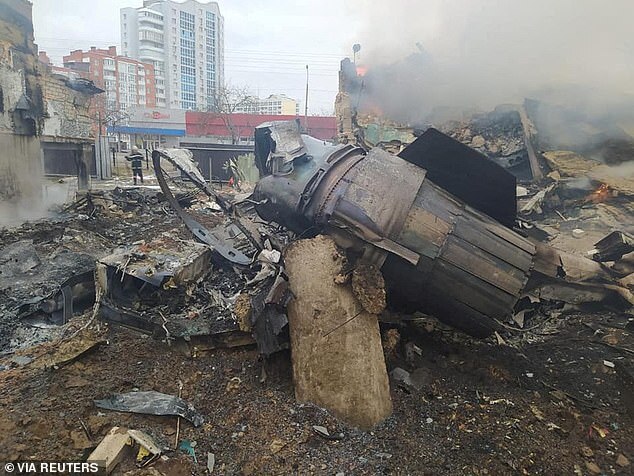 The wreckage of a Russian military aircraft is pictured on the outskirts of Chernihiv on March 5