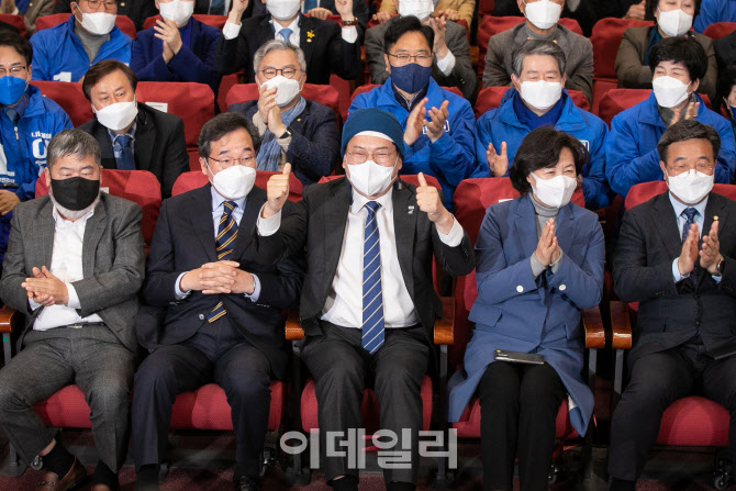 김상희 국회부의장, 김동명 상임선대위원장(한국노총 위원장), 이낙연 총괄선대위원장, 송영길 당대표, 추미애 명예선대위원장 등(앞줄 왼쪽부터) 더불어민주당 캠프 관계자들이 9일 저녁 서울 여의도 국회의원회관에 마련된 제20대 대통령선거 개표상황실에서 출구조사 결과를 지켜보며 기뻐하고 있다.