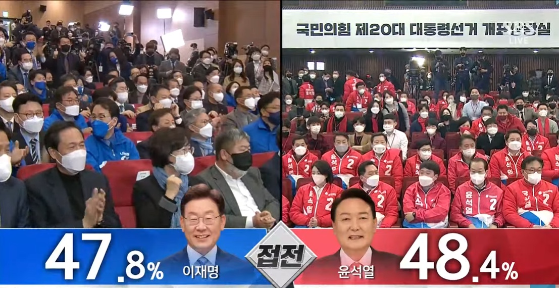 오후 7시 반, 오차범위 내 접전 속 윤석열 당선인이 앞서는 지상파 3사와 이재명 후보가 앞서는 다른 출구조사 결과를 함께 받아든 양당.