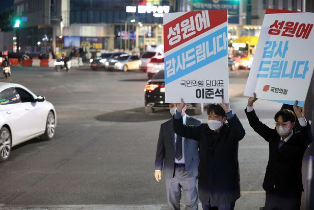 이후 이 대표는 ‘성원에 감사드립니다’라고 적힌 손팻말을 들고 퇴근길 시민을 향해 고개 숙여 인사하기도 했다. 일부 시민은 “잘생겼다” “잘하시라” 등의 응원을 건넸고, 차량 경적을 울리거나 비판의 목소리를 내는 사람도 있었다.