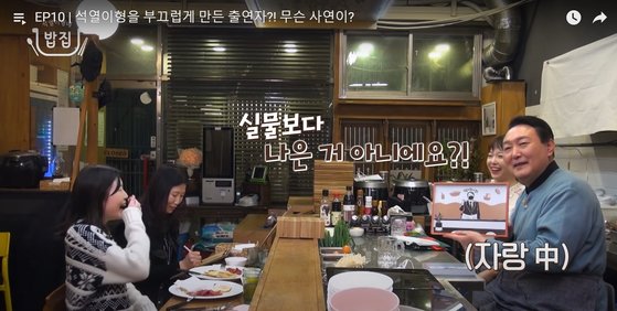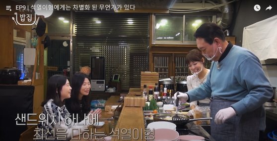 대선 전 공개된 윤석열 국민의힘 대통령 후보 캠프의 유튜브 콘텐트 '석열이형네 밥집'에서 윤 후보가 손님들을 위해 요리하고 있다. '석열이형네 밥집' 유튜브 캡처
