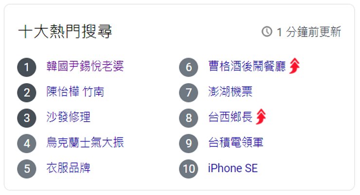 윤석열 대통령 당선인 소식이 전해지자 지난 10일(현지시간) 대만인이 널리 사용하는 ‘야후 대만’ 실시간 검색어에 ‘한국 윤석열 아내’라는 키워드가 상위권에 올랐다.