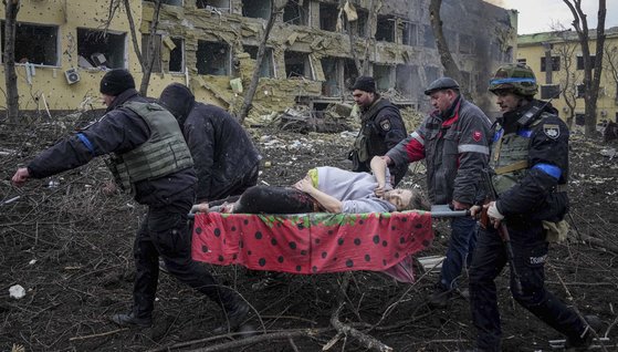 우크라이나 마리우폴에서 9일 우크라이나 긴급구조사들이 임산부를 급히 이송하고 있다. 우크라이나 당국은 이날 러시아군이 마리우폴의 산부인과를 포격했다고 밝혔다. AP=연합뉴스