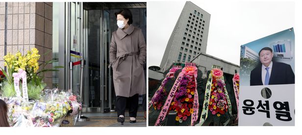 윤석열 검찰총장의 직무 집행정지 처분에 대한 집행정지 신청 인용 이튿날인 2일 경기 과천 법무부 청사에서 추미애(왼쪽) 법무부 장관이 청사를 나오며 축하 꽃바구니를 살펴보며 같은 날 서울 서초구 대검찰청 앞에 업무 복귀한 윤석열 총장을 응원하는 화환과 입간판이 놓여 있다 2020.12.02.뉴시스