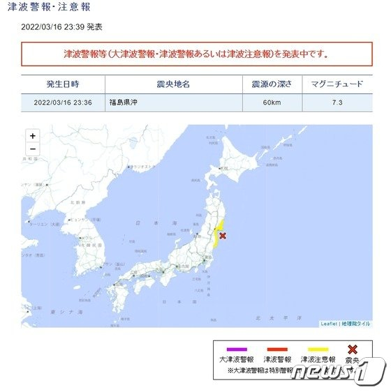 이날 밤 미야기현 이시노마키항에서는 30cm, 센다이항에서는 20cm 등 각지에서 해일이 관측됐다. 쓰나미 주의보는 17일 오전 5시경 해제됐다.