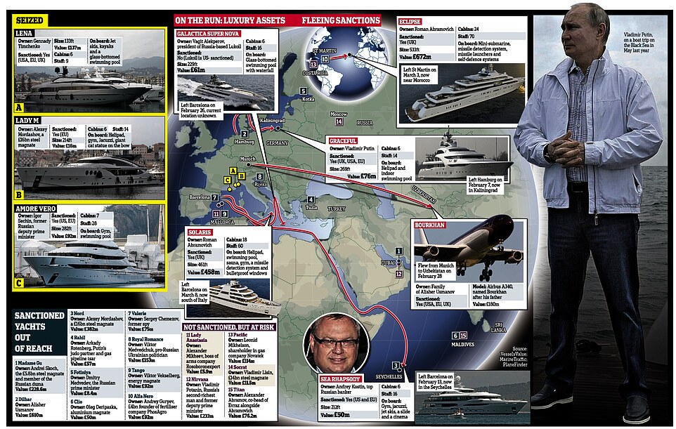 At least four yachts and a private jet owned by sanctioned Russians or their families have escaped the grasp of European officials in recent weeks, a Daily Mail investigation can reveal