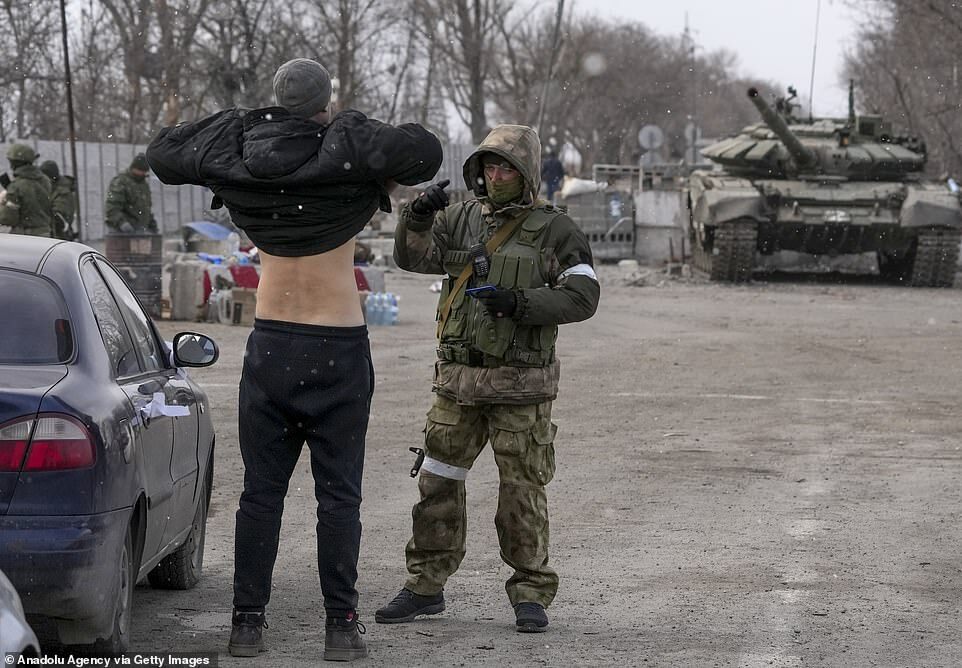 'Several thousand' people have so-far been taken, Mariupol city council claimed, before being processed through 'filtration camps'(pictured, a civilian gets checked by pro-Russian separatists as he flees the besieged southeastern port city of Mariupol)