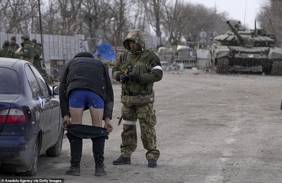 Pro-Putin soldiers were wrapped up against the cold as they allowed civilians to leave Mariupol on Sunday, March 20